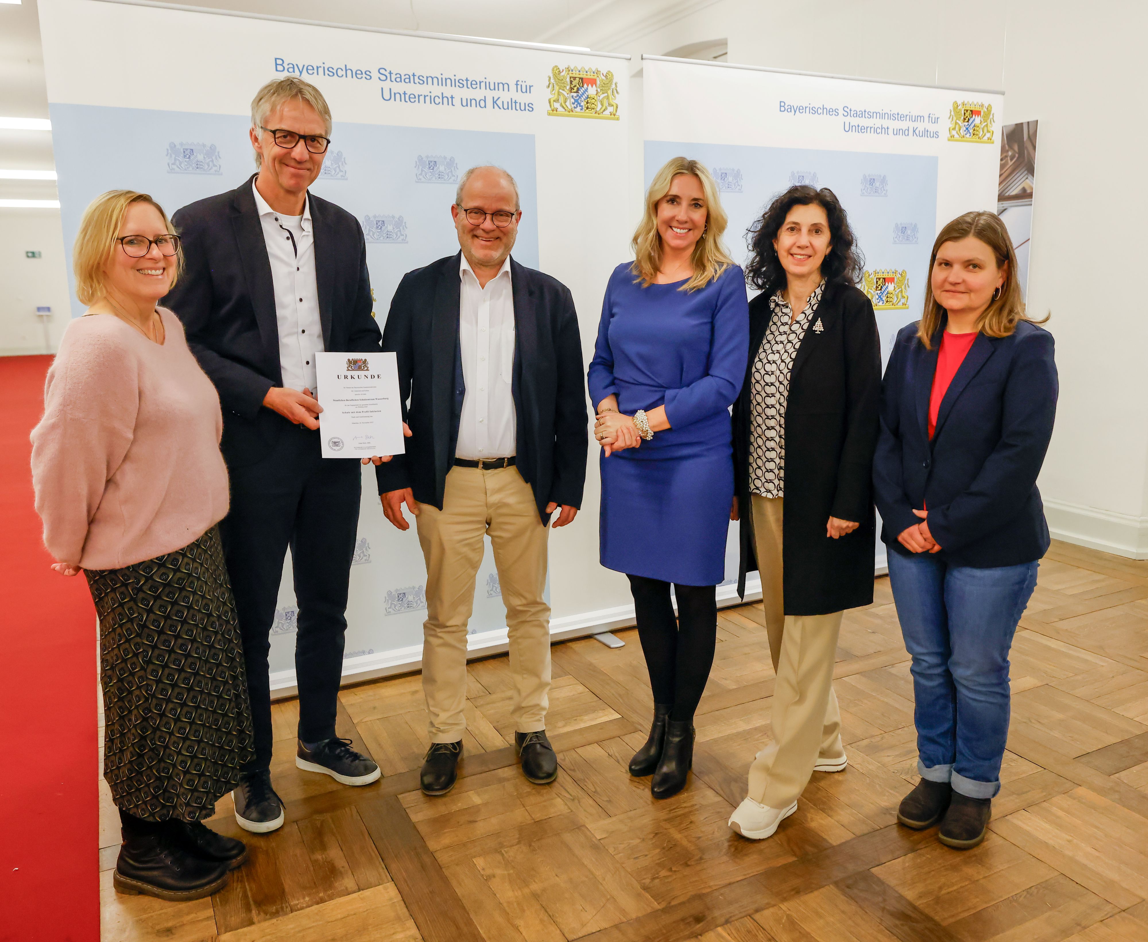 Julia Raithel (Berufliches Schulzentrum Wasserburg), Gerhart Zimmermann (Schulleiter des Beruflichen Schulzentrums Wasserburg), Johannes Kaspar (Schulleiter des Sonderpädagogischen Förderzentrums Wasserburg), Staatsministerin Anna Stolz, Maria Polychronis (Sonderpädagogisches Förderzentrum Wasserburg), Ursula Ammersbach (Berufliches Schulzentrum Wasserburg)